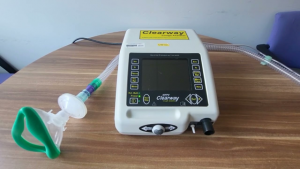 The machine has a tube with a mouth piece attached and the therapist can amend the amount of pressure, number of breaths and timing to suit the patients needs. The machine has two functions, it initially pushed air into the lungs to aid chest expansion and allow impaired patients to take a deep breath. Following a few of these breaths, it will change the pressure rapidly from positive to negative which will suck air out and simulate an effective cough. Typically patients will use it twice per day, once in the morning and once in the evening.